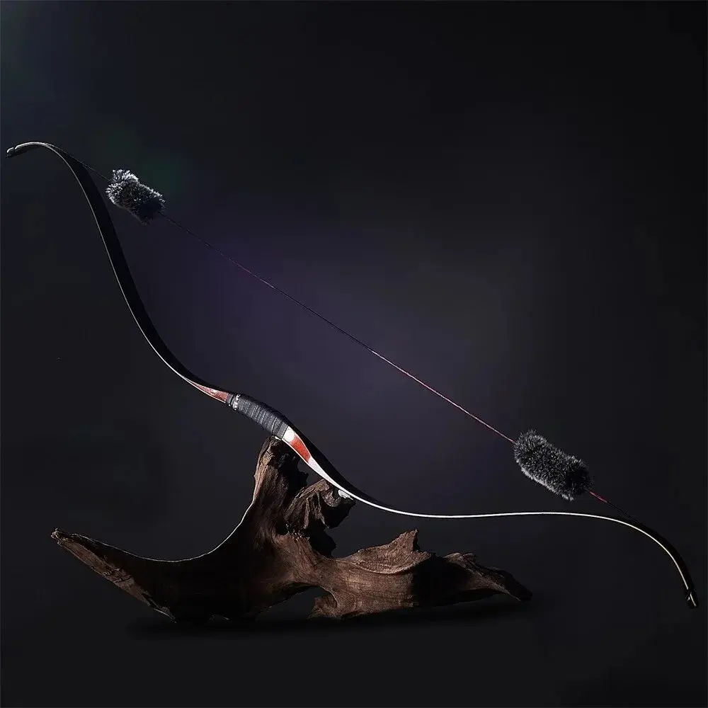 This beautifully crafted longbow represents traditional one piece bows that have been used throughout various cultures in time. It is made with rose wood, bamboo and maple wood along with lamination for durability while also giving it greater accuracy and speed. The black, brown and red color theme give it a touch of elegance to be admired. It comes with otter fur string silencers to reduce noise and vibration while also complimenting the overall design.