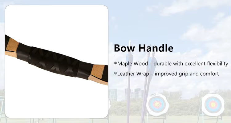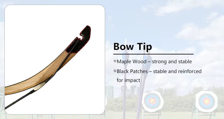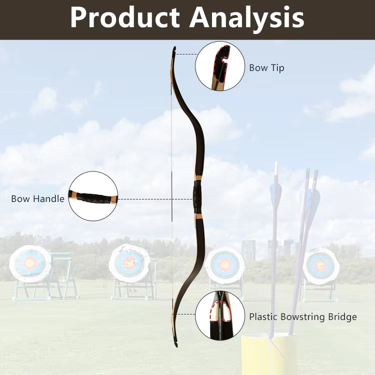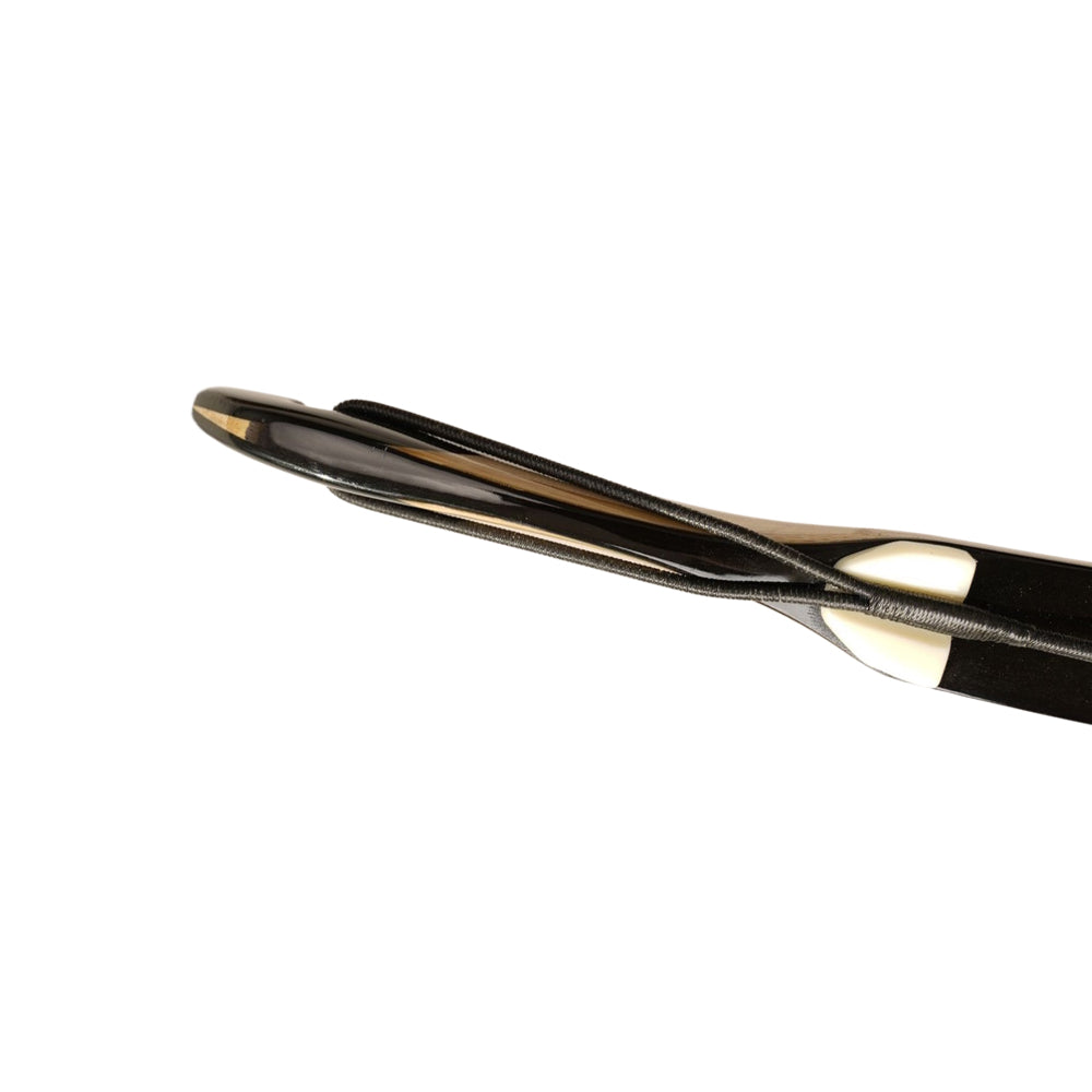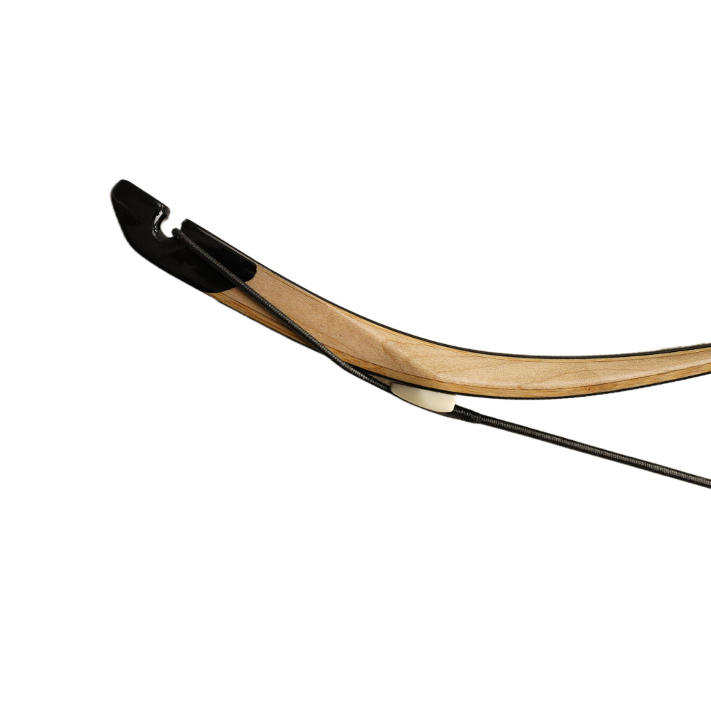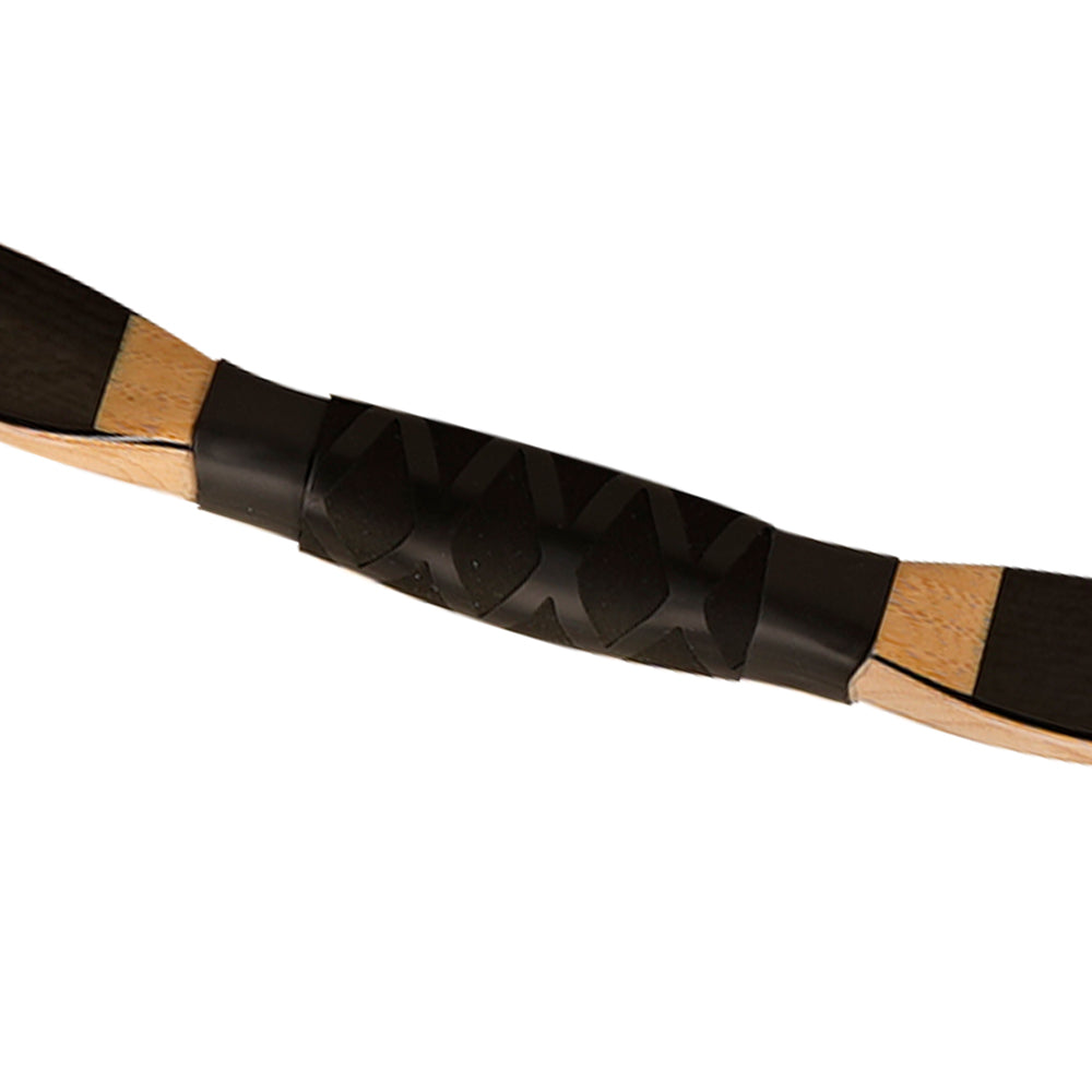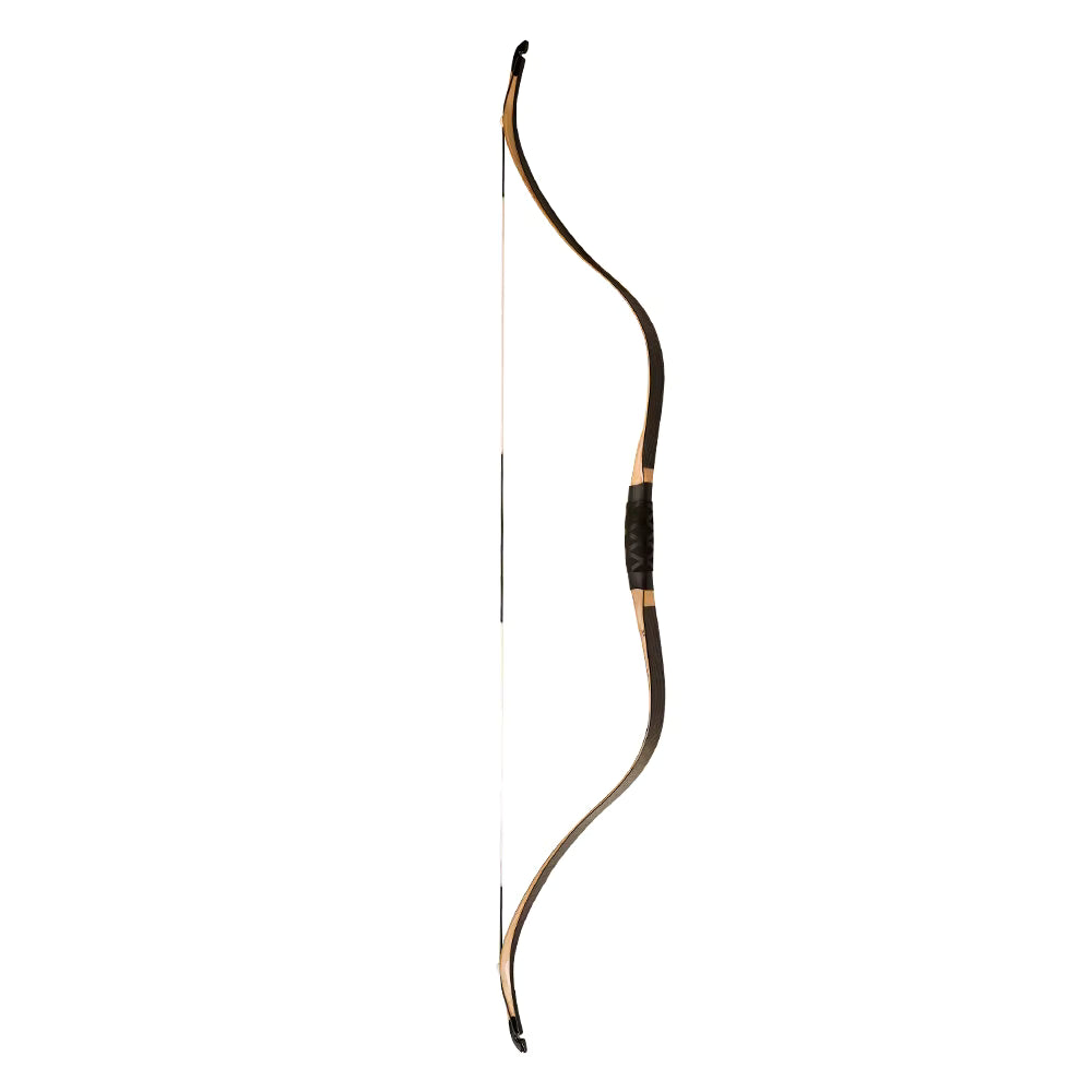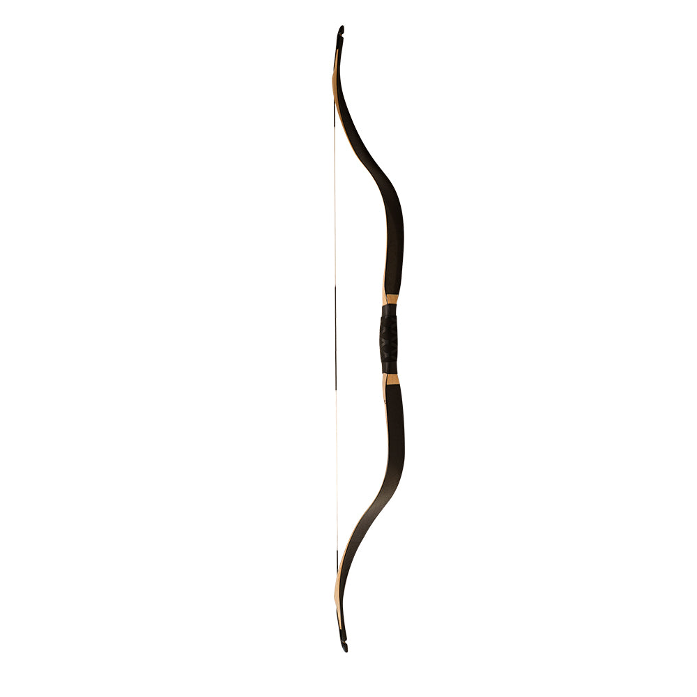 This traditional Tartar bow by AF archery is inspired by the style used amongst Tartar and other nomadic groups in eastern Europe and central Asia. These bows are known for their compact size, making them ideal for use on horseback, and their ability to launch powerful arrows. Tatar bows are characterized by their recurve shape, where the limbs curve away from the archer when unstrung. This design allows for a shorter bow while still achieving a long draw length and powerful cast. This Bow features a sleek black glossy and light brown look with laminate bamboo and fiberglass limbs providing durability while still being light weight . The shorter length compared to longbows also makes it highly maneuverable. A durable maple wood handle and leather grip add comfort and precision when shooting as well.