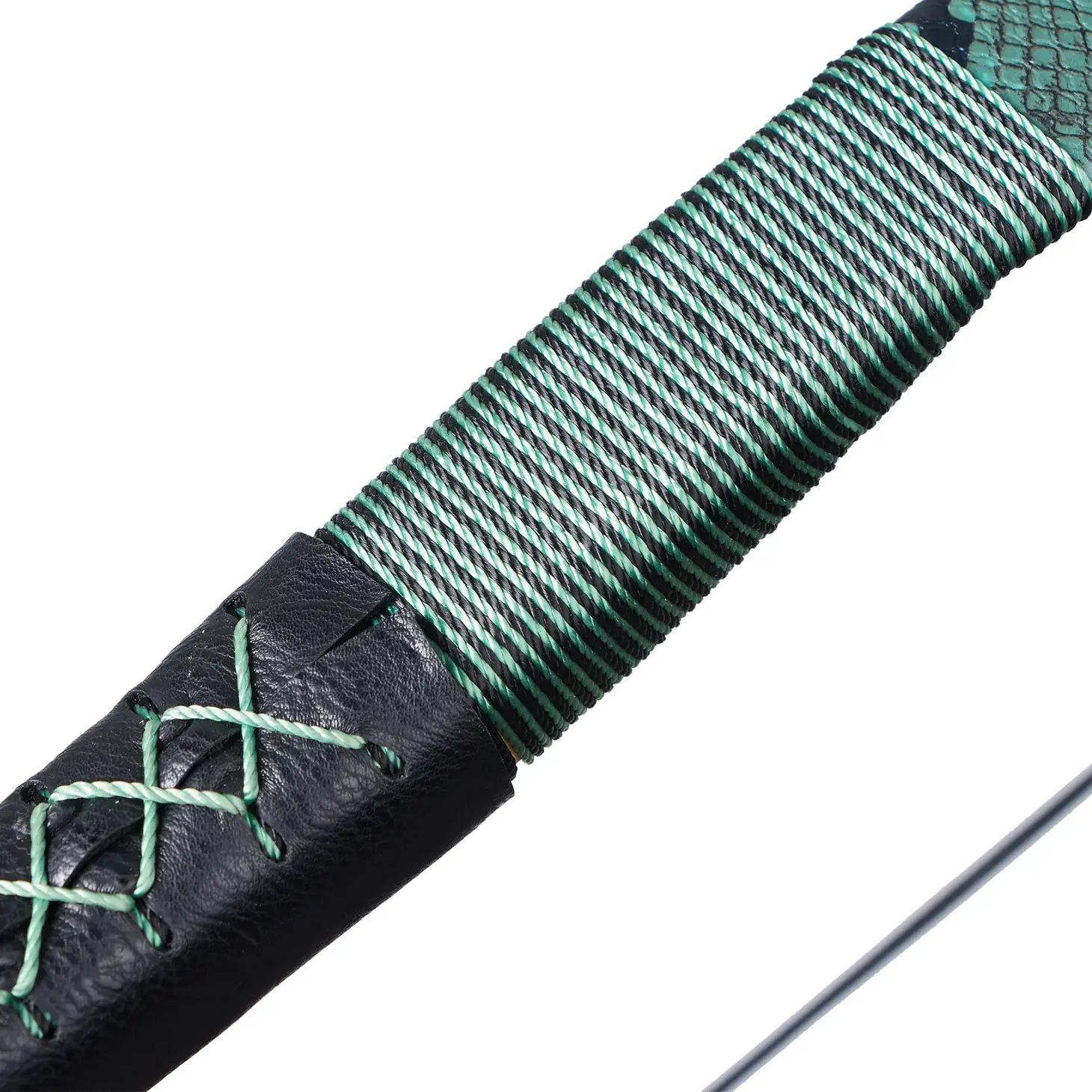 This is a Mongolian inspired traditional bow. It is made of wood and fiberglass sheets. The riser is leather wrapped for comfort. It also features a intricate green snakeskin design on the limbs. It can be used by those both left and right handed. It comes in draw weights ranging from 20-50 lbs.