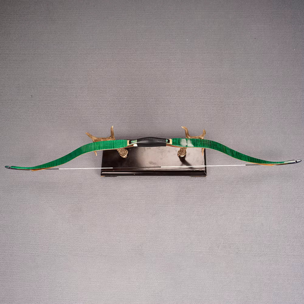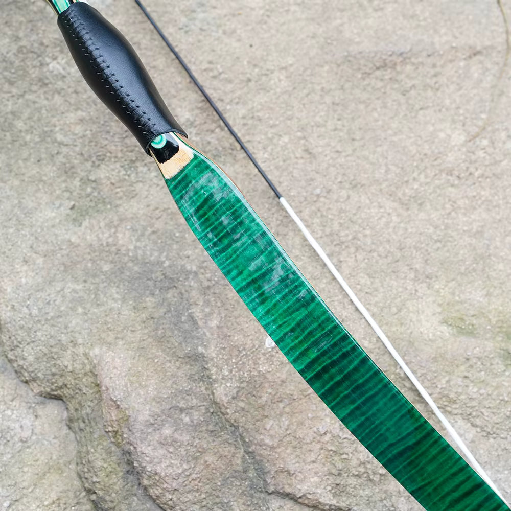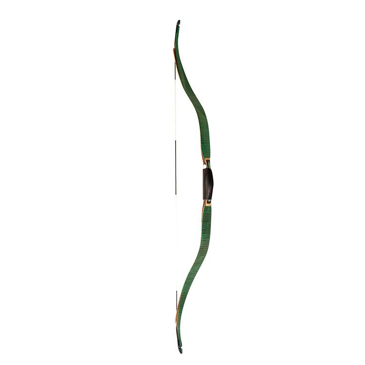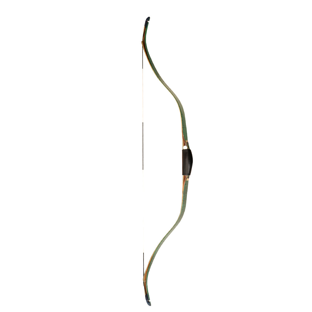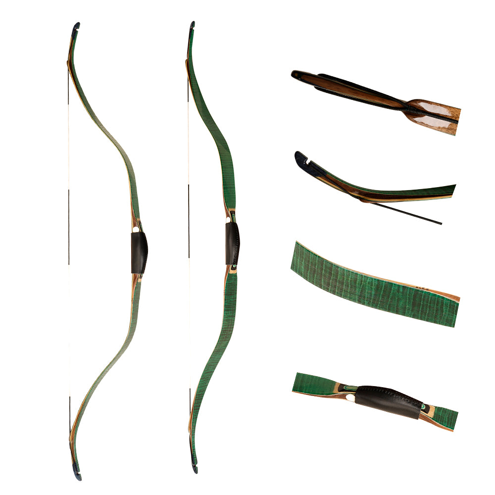 This traditional recurve bow draws inspiration from Ottoman archery a style which is known for its compact size, powerful draw and accuracy abilities. It is also known for its use on horseback. This bow is handcrafted from bamboo and laminated for durability. It features a beautiful green limb design with a black leather grip. This bow its lightweight while still delivering power in the hands of the skilled archer.