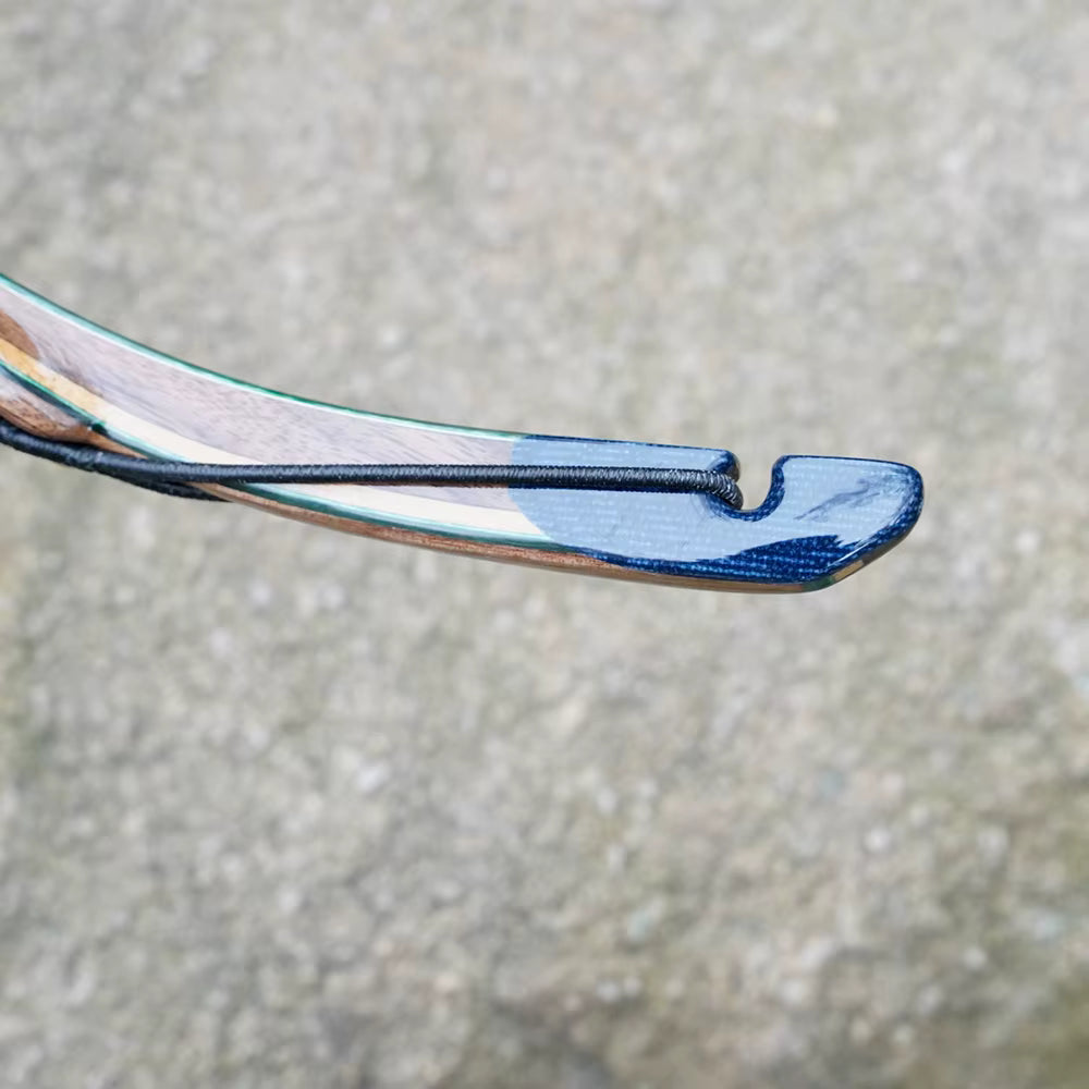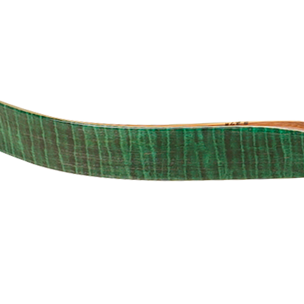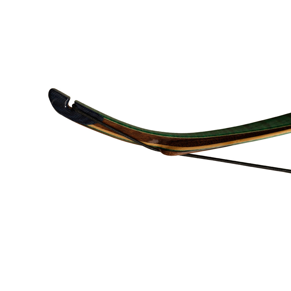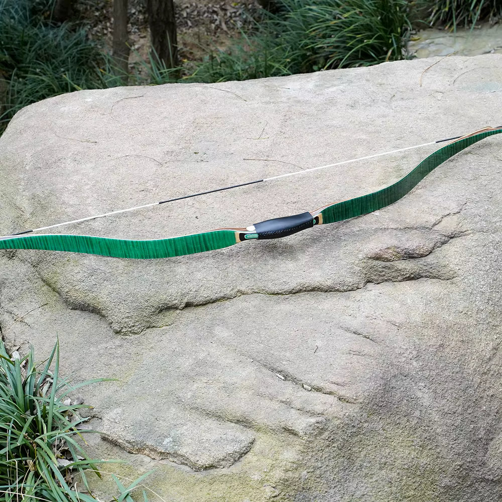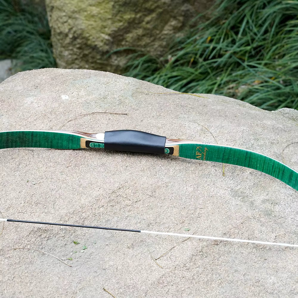 This traditional recurve bow draws inspiration from Ottoman archery a style which is known for its compact size, powerful draw and accuracy abilities. It is also known for its use on horseback. This bow is handcrafted from bamboo and laminated for durability. It features a beautiful green limb design with a black leather grip. This bow its lightweight while still delivering power in the hands of the skilled archer.