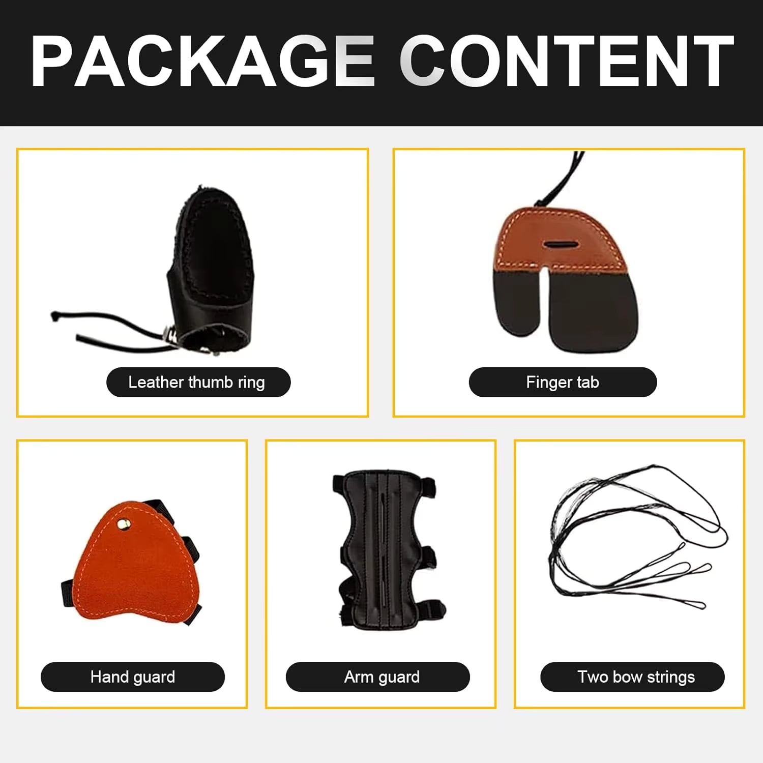 Pack includes: Bow, two bowstrings, armguard, handguard, leather thumb ring, and finger tab.